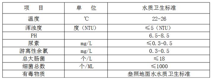 隨著人們生活水平的提高,游泳館已成為人們經(jīng)常光顧的娛樂、休閑、體育鍛煉的重要場(chǎng)所之一,為保證人工游泳池的水質(zhì)標(biāo)準(zhǔn),我國(guó)目前已頒發(fā)了《游泳場(chǎng)所衛(wèi)生標(biāo)準(zhǔn)》和《游泳池給水排水設(shè)計(jì)規(guī)范》兩個(gè)法規(guī),其中對(duì)人工游泳池的水質(zhì)標(biāo)準(zhǔn)規(guī)定如下: